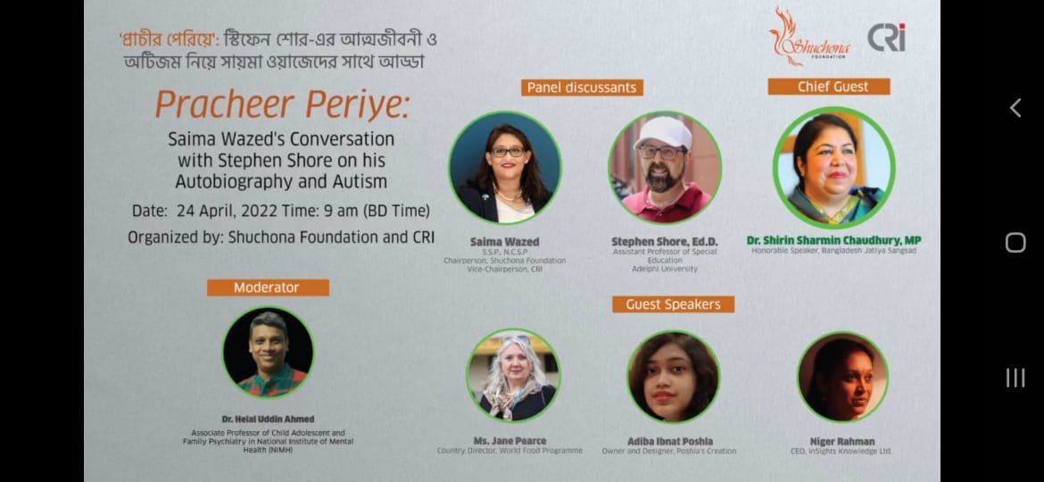 Shuchona Foundation organized the webinar session titled ‘Pracheer Periye: Saima Wazed’s Conversation with Stephen Shore on his Autobiography and Autism’ in collaboration with Centre for Research and Information (CRI) to unveil the book and to have a fruitful discussion over the importance and need of the translation as well as raising awareness.